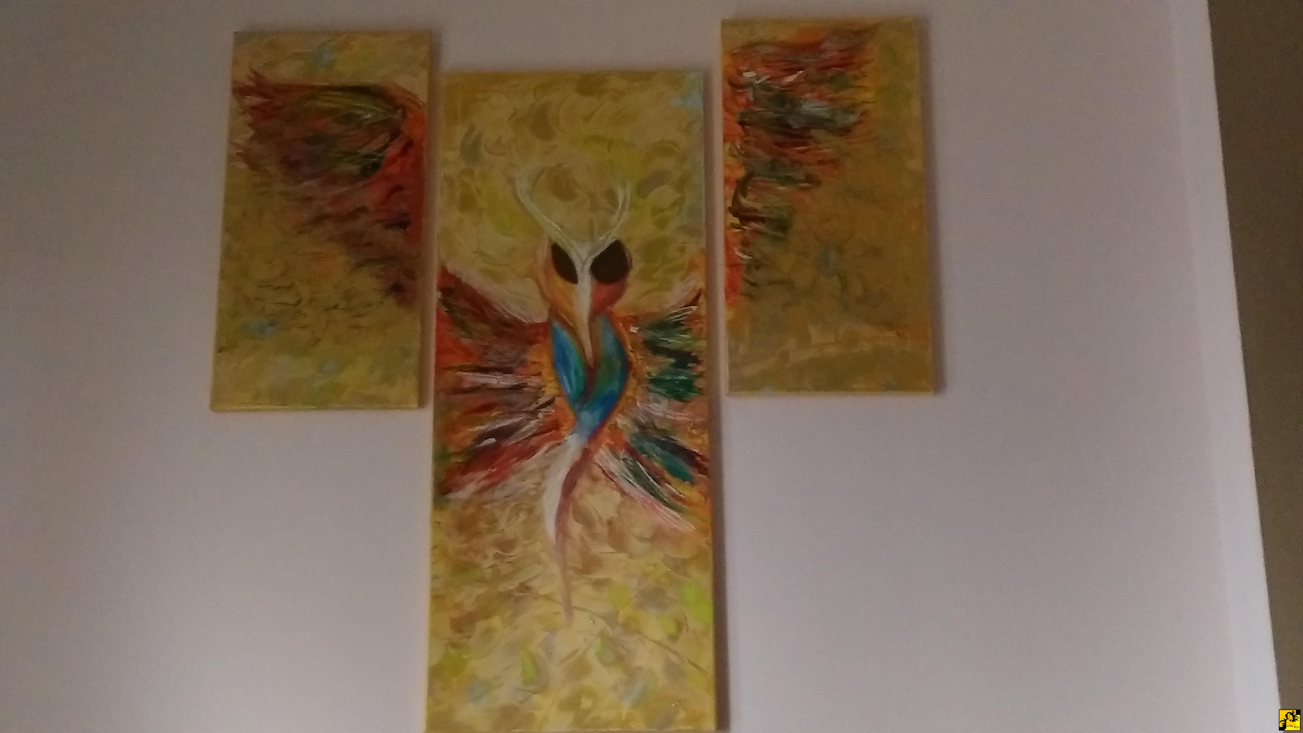Obraz wykonany farbami akrylowymi za pomocą szpachelki. 2 płótna o wymiarach 30x60, 1 płótno o wymiarze 50x100. |