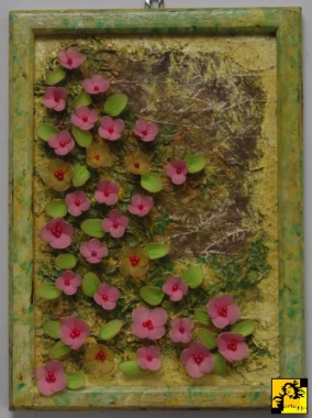 Wyklejona liśćmi pomalowana akrylami.(łączka) na której rosną pończoszkowe drobne kwiatuszki.Oryginalnie a może raczej kontrowersyjnie? Wymiar 34cm-24cm