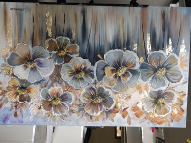 Przedstawiam nowoczesny obraz mojego autorstwa, namalowany profesjonalnymi farbami akrylowymi firm: Winsor & Newton, Amsterdam oraz Liquitex, na podobraziu bawełnianym o wymiarach 80 x 50 cm, pokryte płótnem włoskim o doskonałej jakości. Obraz zawiera złote elementy, m.in. złoto płatkowe, które świecą w zależności od kąta padania światła. Obraz prezentuje się bardzo oryginalnie i przykuwa swoją uwagę. Dzięki odpowiednio dobranym barwom będzie pasował do większości pomieszczeń. Kolorystyka użyta do stworzenia obrazu (odcienie): złota, bieli, brązu, szarości, grafitu, czerni, pomarańczu, fioletu. Obraz został zabezpieczony i wykończony werniksem. Podpis autora znajduje się na awersie. Obraz wysyłam tylko za pośrednictwem Poczty Polskiej, jako przesyłkę priorytetową wraz z ubezpieczeniem. Istnieje również możliwość osobistego odbioru.