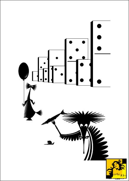 qu-trampo i qu-trempo w ścianach domina, grafika cyfrowa, format A4 (210 x 297mm), papier biały - g200, antyrama |