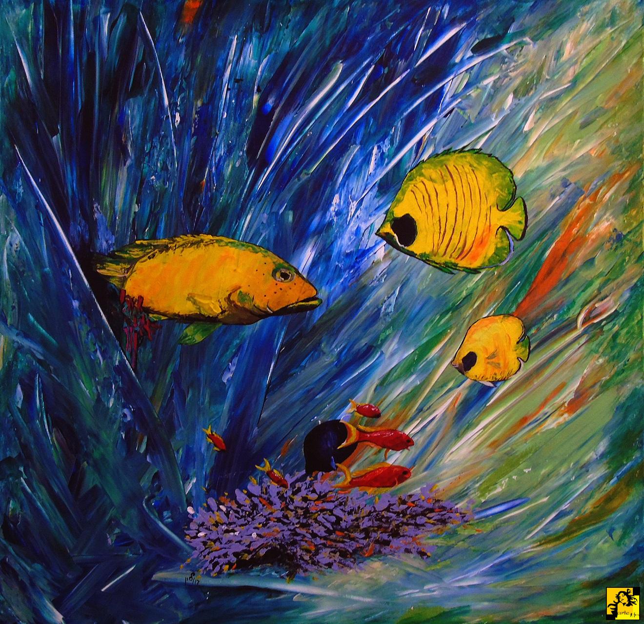 Swiat podwodny,rafy koralowe,obraz namalowany farbami akrylowymi na plotnie bawełnianym ,wymiary 60x60cm,sygnowany,zamalowane boki |