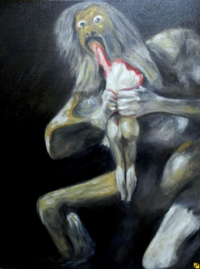 Obraz przedstawia Saturna, boga w mitologii rzymskiej, pożerającego swojego syna. Obraz namalowany ręcznie farbami olejnymi na płótnie o wymiarach 35x45cm.