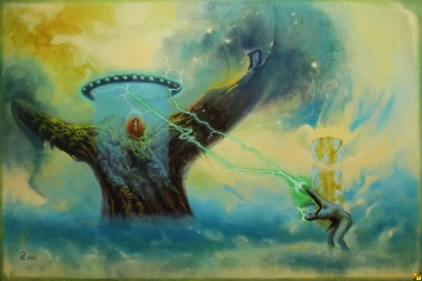 Praca pt. \"Strażnik. Jest to praca numer 26 z cyklu \"Gdzieś daleko stąd\". Technika olejna. Rozmiar płótna 90x60. Sygnowany i zawerniksowany.