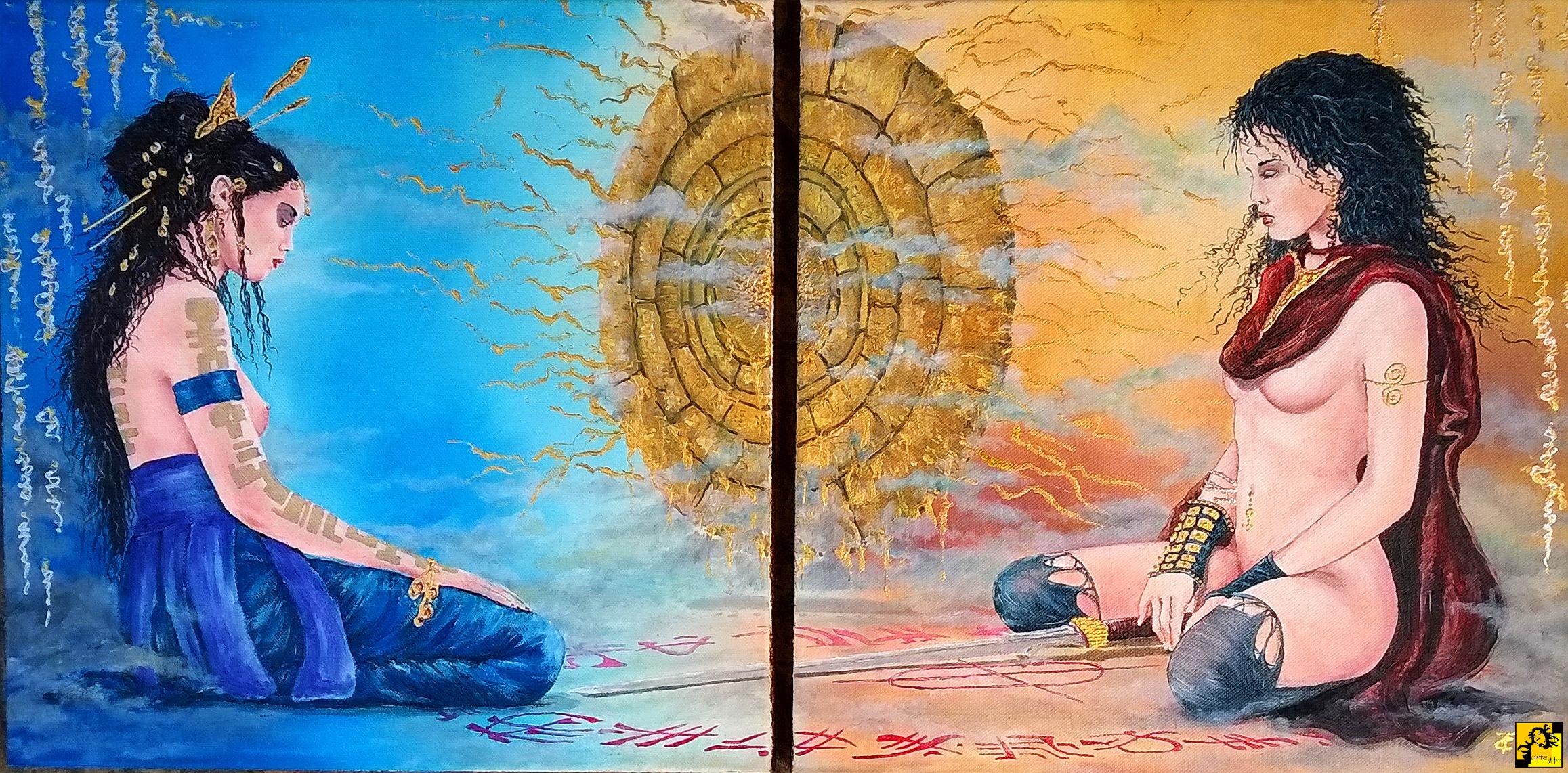 Tomasz Celmer: "Tajemnicze wojowniczki-olej na płótnie 2x 40x40cm"