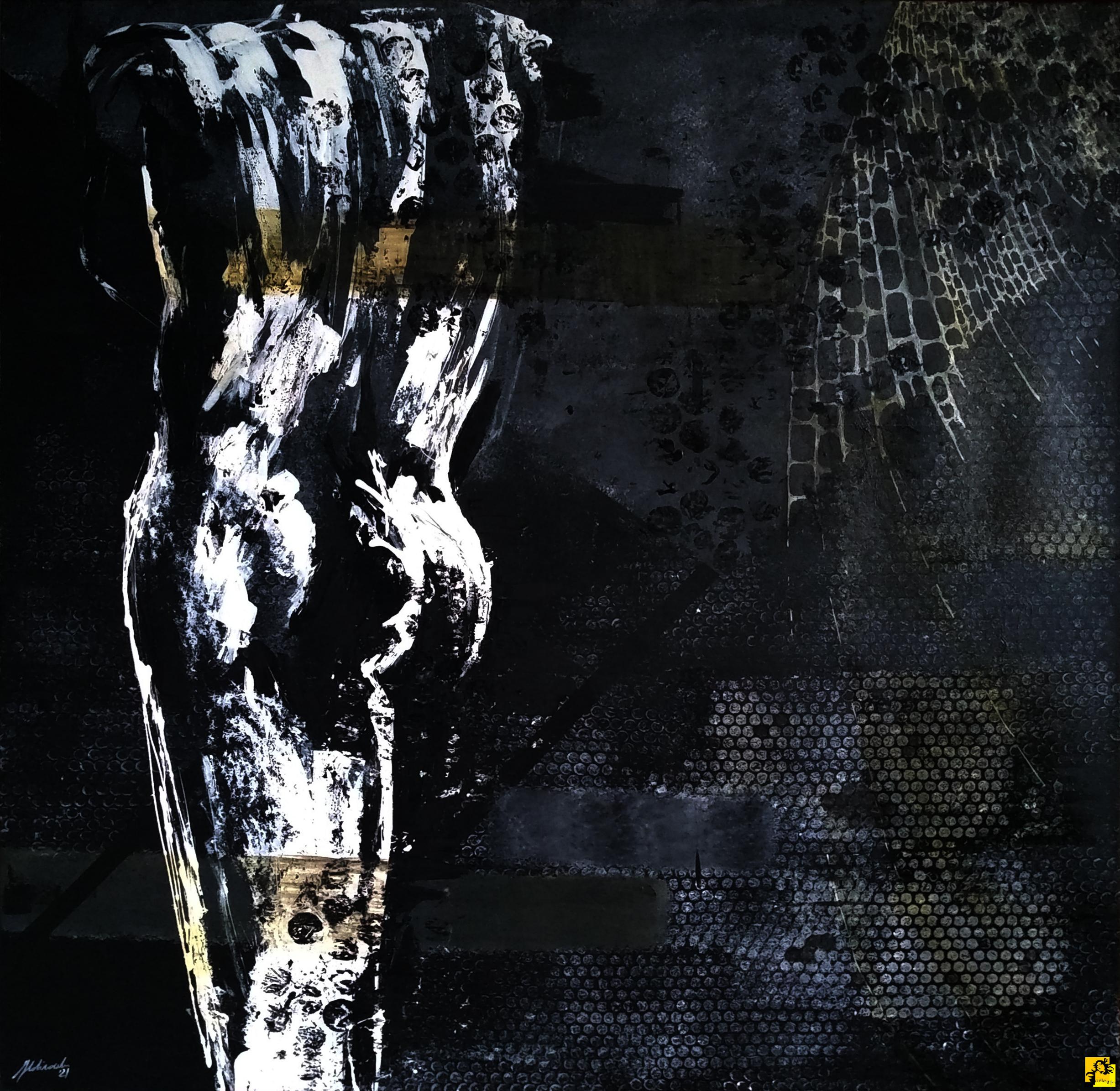 W artystyczny sposób przedstawienie problemu widzenia współczesnego mężczyzny w świecie coraz bardziej dominujących kobiet. Figuratywna postać samca, obnażonego i bezbronnego w rzeczywistości która do złudzenia przypomina ul. Próba okazania jego coraz bardziej materialno-genetycznej roli. Sylweta celowo zniekształcona, miejscami złamana, pozbawiona twarzy pozwala widzowi osadzić własnego "samca" w roli trutnia. Obraz olejny na podobraziu bawełnianym, wymiar 100x100cm.2021 |