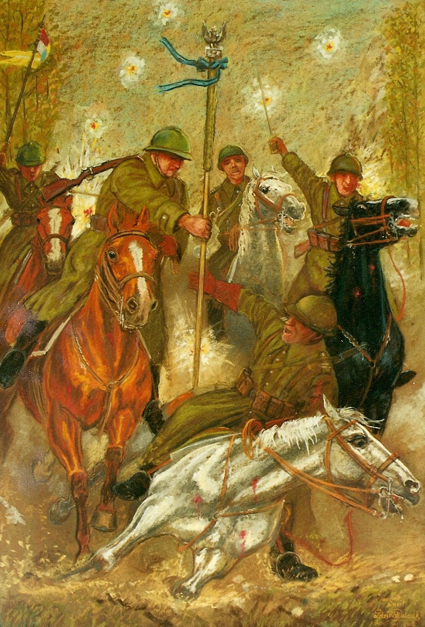 suchy pastel , 91x62 cm , 2002 r. Na obrazie przedstawiam epizod bitwy .Dowódca 14. Pułku Ułanów Jazłowieckich z Podolskiej BK płk dypl. Edward Godlewski podjął decyzję o skróceniu drogi do Warszawy i postanowił skręcić na południe do Mościsk. Razem z nim tę trasę obrała także mała część 9. Pułku Ułanów Małopolskich. Niespodzianie oba pułki natknęły się w Wólce Węglowej na Niemców, lecz płk E. Godlewski nie zmienił decyzji, tylko dał znak do szarży. Ułanów do brawurowego ataku poprowadził dowódca 3. szwadronu 14 p. uł. por. Marian Walicki. Dzięki zaskoczeniu Niemców podczas odpoczynku i odwadze polskich żołnierzy pozycje wroga zostały przełamane. Niestety nie rozpoznano, że w Mościskach, na skraju wsi, ustawione jest gniazdo niemieckich karabinów maszynowych i stoją czołgi, które zasypały szarżujących seriami pocisków. W rezultacie kosztem ciężkich strat (ok. 105 zabitych ułanów i 100 rannych, tj. łącznie ok. 20% stanu, w wyniku poważnych ran zmarł także por. M. Walicki), natarcie powiodło się; oba pułki przebiły się do Warszawy. Po bitwie Orderem Virtuti Militari przez gen. Juliusza Rómmla odznaczony został kpr. Mieczysław Czech, który podczas szarży podjął drzewce sztandaru 14 p. uł. od rannego ułana i tym samym uratował je. |